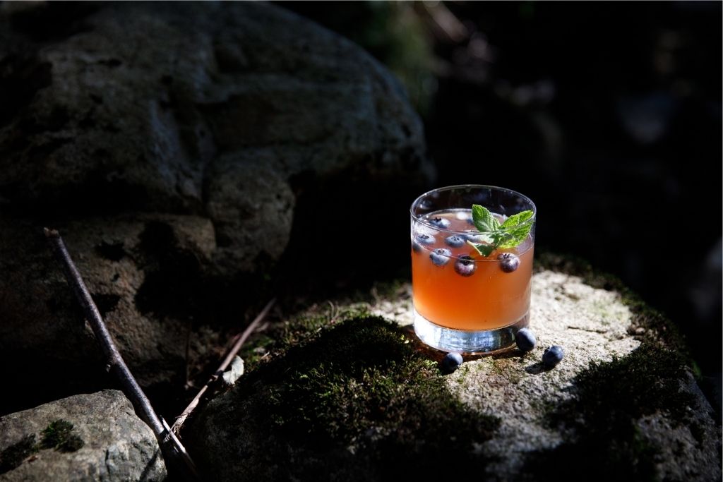 Add sparkling water and shake gently. Pour into a glass and garnish with fresh blueberries and a sprig of fresh mint.