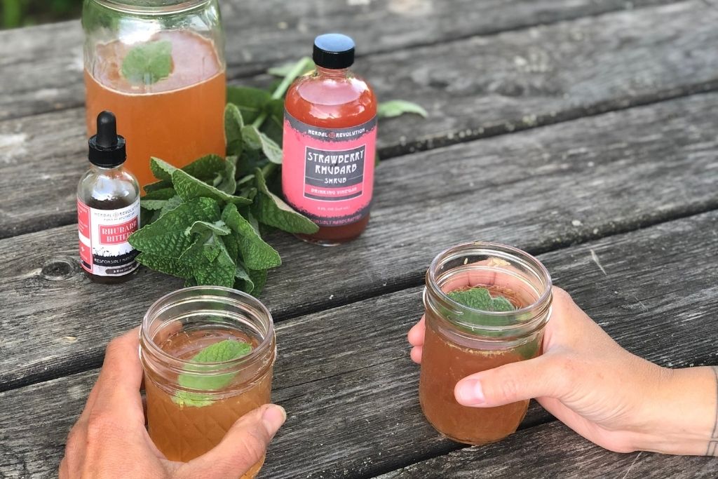 Place 2 Tbsp of the Strawberry Rhubarb in a jar and add 2 Tbsp Lemon Zest Honey Syrup, 2 tsp of Rhubarb Bitters, cover jar and shake. Then add 2 cups sparkling water, cover, shake and serve in two glasses. Garnish with fresh mint and Enjoy!