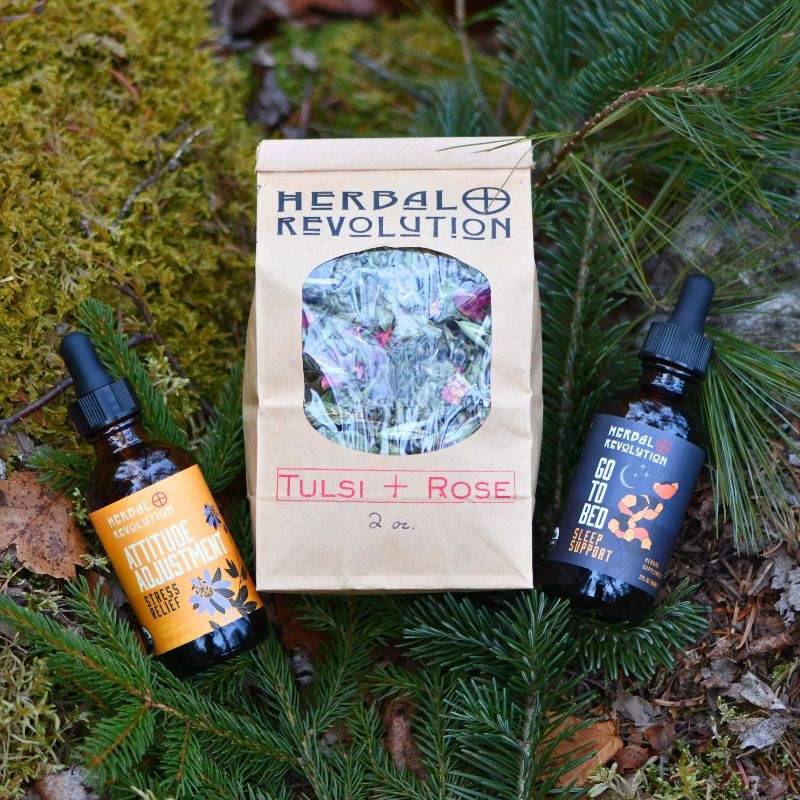 Our coping kit includes Attitude Adjustment Stress Relief Elixir, Go To Bed Sleep Elixir, and nerve-caliming Tulsi + Rose Tea (2 oz). Stop, drop, and sip.