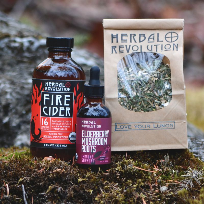 Includes Fire Cider (8 oz), Elderberry Mushroom Roots Elixir (2 oz), and Love Your Lungs Respiratory Support Tea (2 oz).